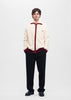 A contemporary essential crafted for refined comfort. This zip-through jacket is offering both warmth and a soft touch. The clean ivory body is accentuated with deep bordeaux trims along the zipper, cuffs, and hem, creating a subtle yet striking contrast.